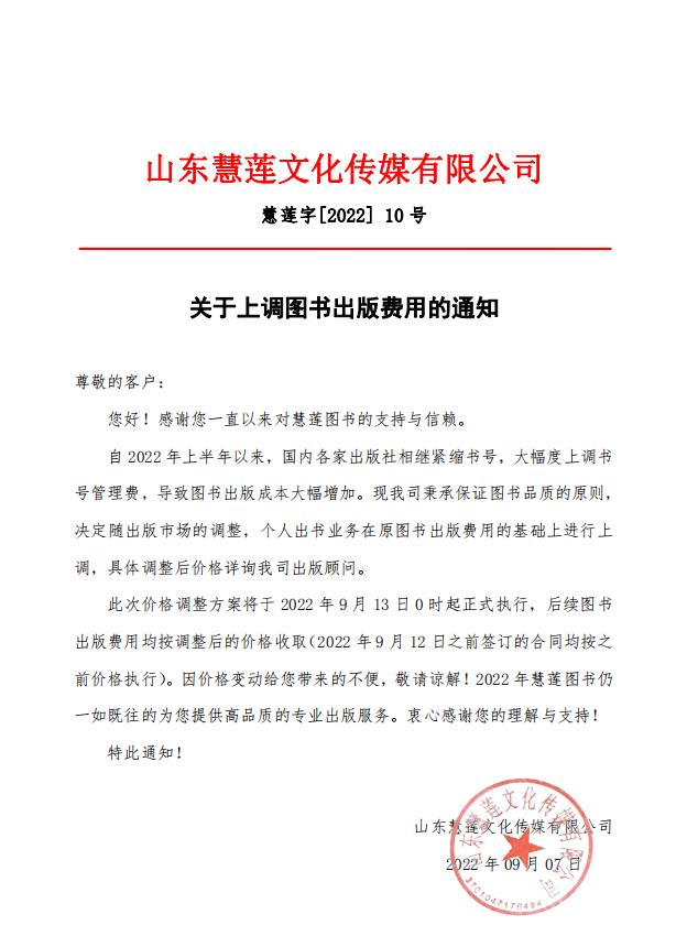 【慧蓮出版】——慧蓮圖書出版費(fèi)用調(diào)整通知