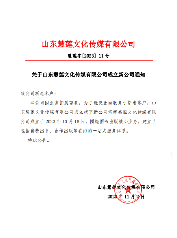 【慧蓮出版】——關(guān)于山東慧蓮文化傳媒有限公司成立新公司通知